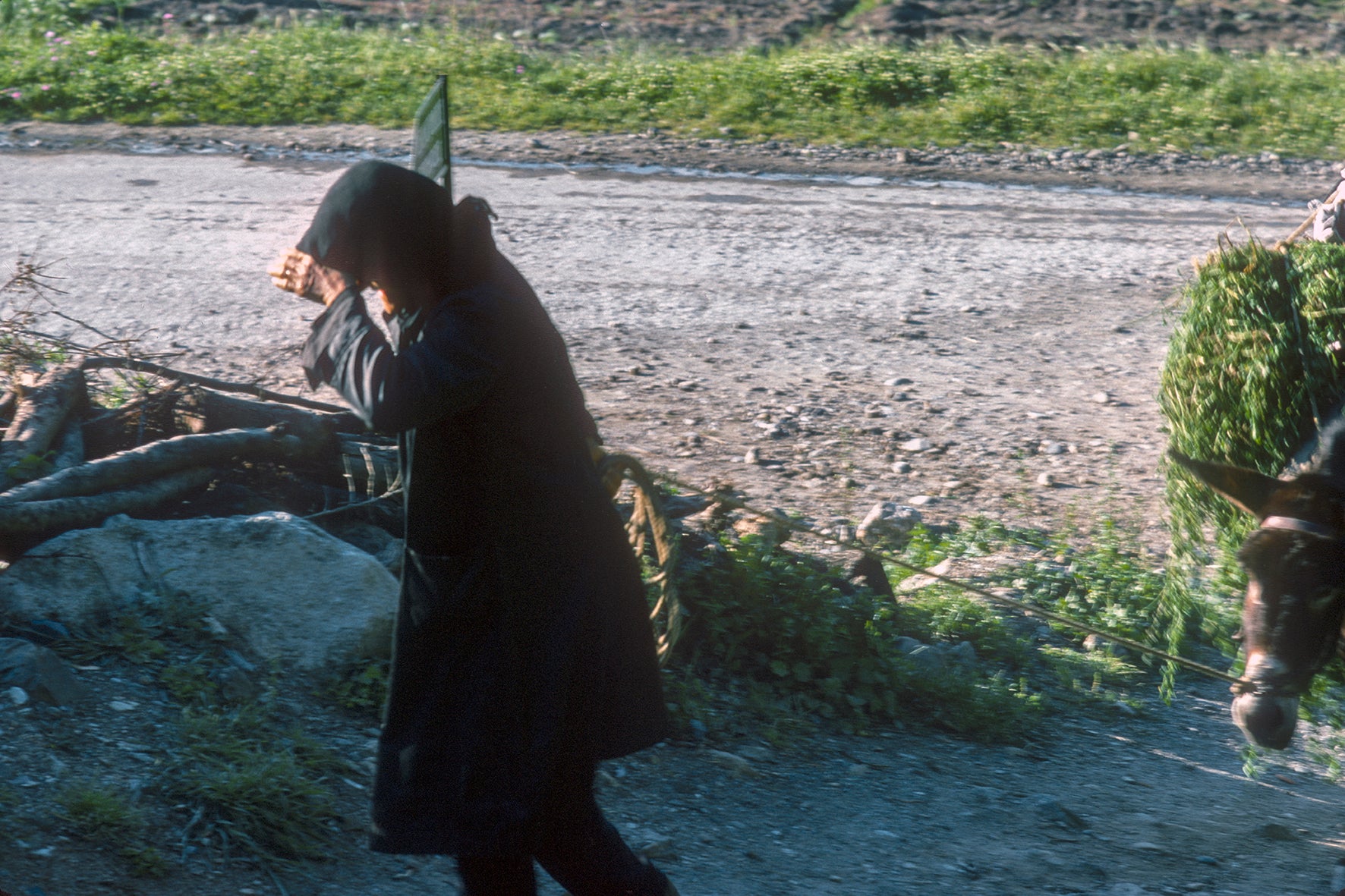 Η χωρική με το φορτωμένο γαϊδουράκι της κρύβεται από τον ήλιο και τον φωτογραφικό φακό.