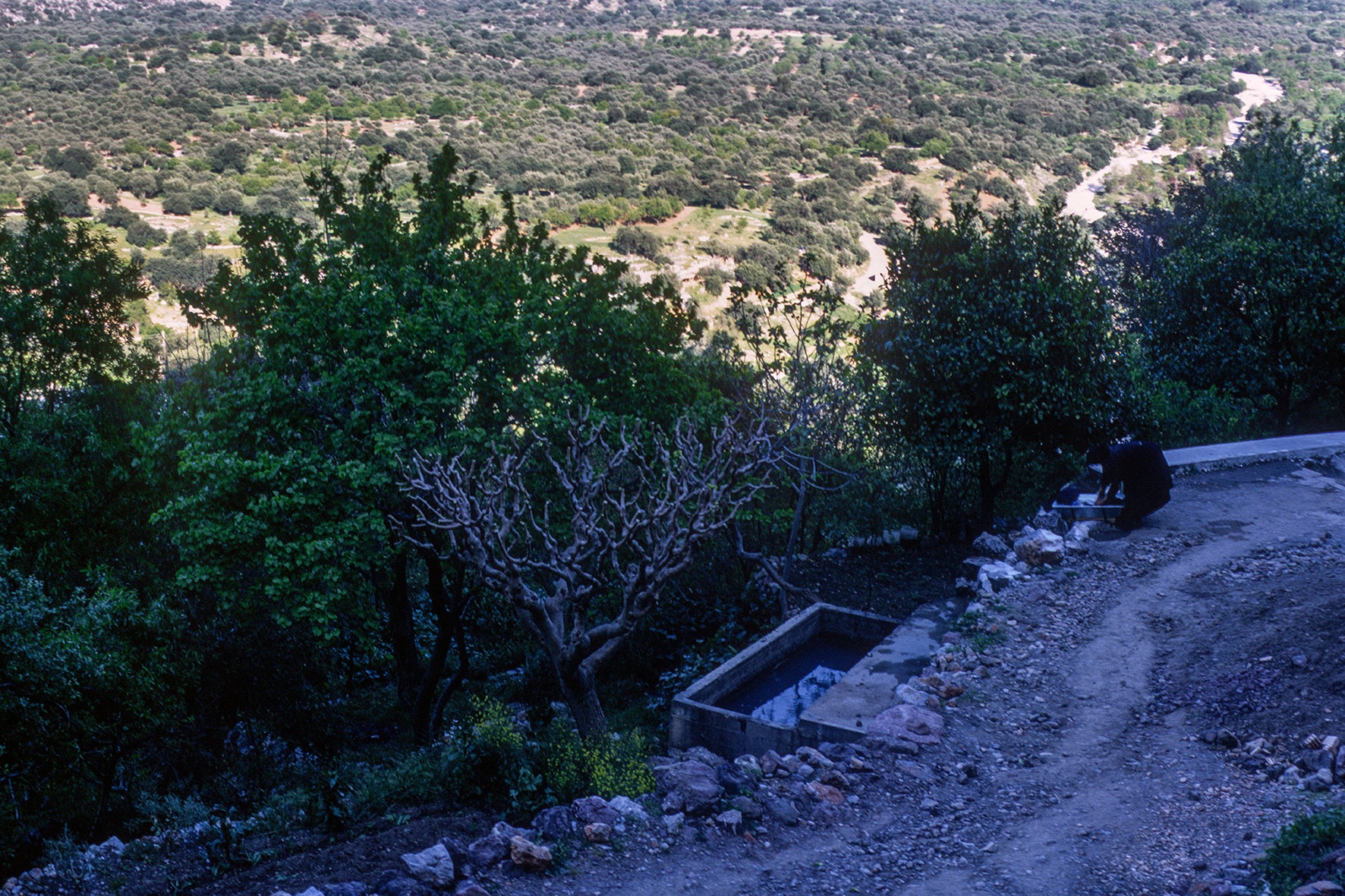 Πηγαίνοντας προς το οροπέδιο Καθαρό, σε δύσβατο δρόμο, στην άκρη του μια γιαγιά πλένει στην σκάφη.