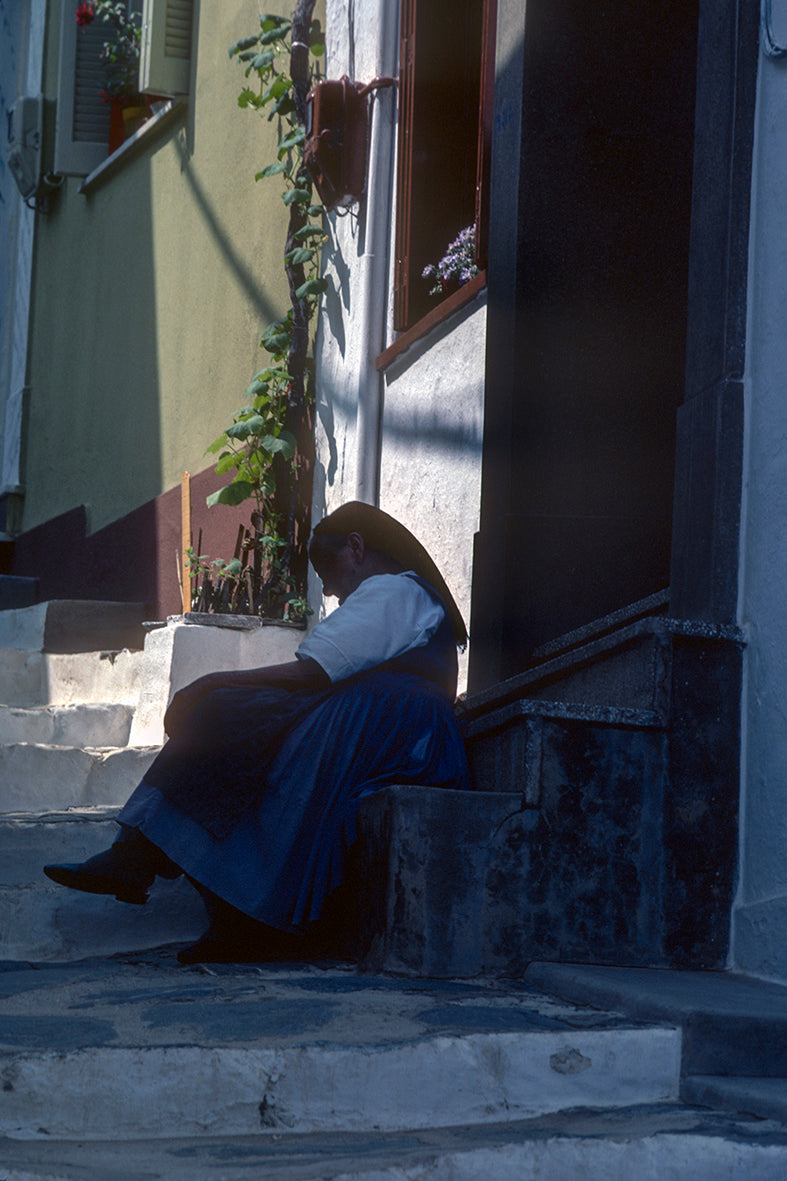 Μία Σκοπελίτισσα στην σκάλα του σπιτιού της