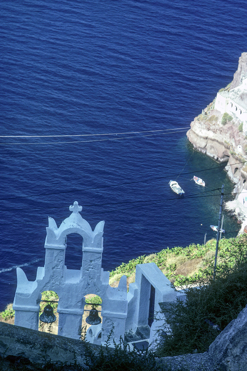 Σαντορίνη από ψηλά, καμπαναριά και βαρκάκια
